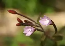 Цветки в пазухах верхних листьев. Бутоны яйцевидные, короткозаострённые, покрытые коротким опушением[3]. Чашечка колокольчатая, в основании с коротким оттопыренным железистым и простым опушением, с ланцетовидными чашелистиками 5—6×1—1,5 мм, трубка около 2 мм длиной. Венчик с четырьмя розовыми лепестками 7—10 мм длиной, продолговато-обратнояйцевидной формы, глубоко двулопастными на верхушке. Рыльце пестика выраженно четырёхлопастное, лопасти расходящиеся, продолговато-линейные[3][2]. Завязь по рёбрам покрыта простым серповидным, и по граням — железистым, приподнятым над более коротким простым, опушением[4].