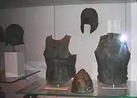 Древнегреческий бронзовый панцирь (кираса) и различные шлемы.