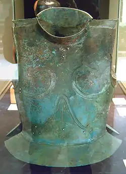 Уже микенская Греция знала достаточно совершенный доспех в виде длинной, почти до колен, сегментированной пластинчатой кирасы из бронзы, дополненной шлемом, поножами и наплечниками, вероятно и наручами, и, таким образом, закрывающий практически всё тело воина. Наиболее вероятно, что подобные доспехи предназначались для боя на колесницах, поскольку, ввиду своей конструкции, для пешего боя такая кираса была бы попросту неудобна, но при этом обеспечивала бы отличную защиту сравнительно малоподвижному колесничному бойцу.[2]