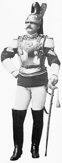 состоит из шлема и кирасы, носился с ботфортами и крагами (перчатками с крагами)