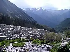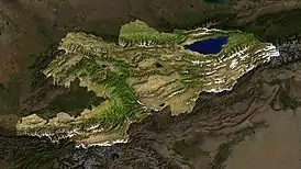 Более трёх четвертей территории Киргизии занимают горы. Территория страны расположена в пределах двух горных систем. Северо-восточная её часть лежит в пределах Тянь-Шаня, юго-западная — в пределах Памиро-Алая. Вся территория республики лежит выше 394 м над уровнем моря, средняя высота над уровнем моря — 2750 м. Более половины её территории располагается на высотах от 1000 до 3000 м и примерно треть — на высотах от 3000 до 4000 м. Пик Победы является наивысшей точкой страны и самым северным семитысячником на Земле, его высота — 7439 м. На востоке главные хребты Тянь-Шаня сближаются в районе Меридионального хребта, создавая мощный горный узел. На границе с Китаем и Казахстаном поднимается пик Победы (7439 м) и Хан-Тенгри (7010 м или 6995 м без учёта ледяного покрова)[26]. Западная часть Киргизии расположена в пределах Западного Тянь-Шаня. Его важнейшие орографические элементы: