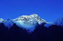 ![]() Пик Хан-Тенгри (7010 м или 6995 м без учёта ледяного покрова) — третья по высоте точка республики |