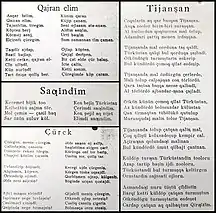 В 1923 году К. Тыныстанов реформировал арабский алфавит, приблизив его к нуждам киргизской фонетики[2]. В 1924 году на этом алфавите И. Арабаевым был издан первый киргизский букварь. В том же году началось обучение на киргизском языке в школах, а также стала выходить первая киргизская газета «Эркин-Тоо»[3].