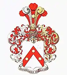 Описание герба: Выдержка из Общего гербовника В серебряном щите изображено укороченное червленое стропило, на нем три золотые шестиугольные звезды. Щит увенчан дворянским коронованным шлемом. Нашлемник: пять страусовых перьев: среднее и крайние — червленые, второе — серебряное, четвертое — золотое. На среднем пере золотая шестиугольная звезда. Намет: червленый, подложен справа серебром, слева золотом. Девиз: «НЕИЗМЕННО ПРАВДОЮ» червлеными буквами на серебряной ленте. |