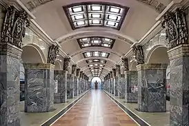 Подземный зал станции облицован дымчато-серым кавказским мрамором «Сванетия». 31 пара колонн, выстроенных в два длинных ряда и соединённых пологими арками, организуют перспективу станций своим чётким ритмом. Вершину каждой колонны украшает отлитый из алюминия горельефный картуш с индустриальной эмблемой. Чеканка и частичная полировка придают горельефам вид серебряных. 32 пары картушей (первая от входа на станцию установлена на краю стены) посвящены четырём основам тяжёлой индустрии: электрификации, каменноугольной, нефтяной и металлургической промышленности. Под горельефами планировали вывесить мраморные доски с письмами ленинградцев «отцу народов» Сталину[11]. Впервые для оформления станций метрополитена применено «люверсное освещение». Люверс представляет собой сквозную решётку, состоящую из полос органического стекла. За ней на определённом расстоянии вмонтированы лампы «дневного света». Позже органическое стекло люверсов снято. Потолок центрального зала украшен лепниной. На ней буква «К» (в характерном для завода рисунке) окружена венками листьев и звездой. У торцевой стены центрального зала установлен бюст В. И. Ленина (скульптор Н. В. Дыдыкин). Через зал к нему ведёт «дорожка» из бордового гранита с чёрно-белым кантом. На дверях путевых стен установлены декоративные решётки с надписью «1955» по году открытия станции.