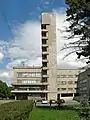 От главного корпуса отходят три перпендикулярных крыла, связанных длинными галереями на столбах. Полукруглый торец с левого края рифмуется с эллипсовидным залом собраний (впоследствии, в 1958 году, реконструированным под кинотеатр), выходящим на проспект Стачек. Во двор вынесена столовая, занимающая приземистый цилиндрический объём.