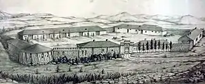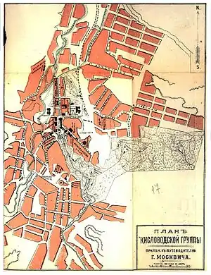 7 марта 1803 года вышел рескрипт Александра I о строительстве укрепления в месте, «где находятся у Кавказских гор кислые воды». В нём поручалось инспектору Кавказской линии князю П. Д. Цицианову «привести в действо укрепление сие, употребив на то воинских служителей»[25]. Крепость Кислые воды, принадлежащая Азово-Моздокской оборонительной линии, была возведена на возвышении между речками, получившими впоследствии названия Ольховка и Берёзовка, на расстоянии пушечного выстрела от источника нарзана. Строительство велось силами шести рот 16-го егерского полка из Константиногорской крепости с июня по октябрь 1803 года.