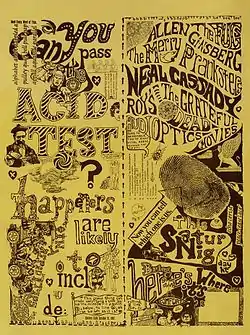 | 1966 | 12 февраля | Комптон (англ. Compton, California) | Уоттсовский тест[26] | Первый Кислотный тест, проведенный без Кизи, вследствие вынужденного бегства в Мексику последнего. Вечеринка вызвала широкий общественный резонанс из-за замаскированной под угощением пуншем раздачи ЛСД — и приковала к коммуне внимание прессы и полиции. Хэппенинг послужил причиной раскола в коммуне. |