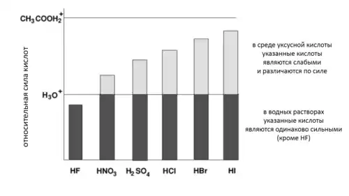 Если растворитель обладает основными свойствами, то в нём все кислоты становятся более сильными и большее число кислот нивелируется по силе (например, в аммиаке уксусная кислота диссоциирует нацело, хотя в водных растворах она имеет среднюю силу). Напротив, если основные свойства растворителя понижаются, то сильные кислоты могут стать слабыми, а число нивелированных кислот понижается[26]. Например, уксусная кислота служит нивелирующим растворителем для хлорной кислоты HClO4, диссоциирующей в ней нацело, и хлороводородной кислоты HCl и серной кислоты H2SO4, являющихся в уксусной кислоте слабыми[27].