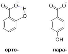 - Водородная связь. Внутримолекулярные водородные связи могут оказывать стабилизирующее влияние на образующиеся анионы и таким образом повышать силу соответствующих кислот. Так, pKa орто-гидроксибензойной кислоты составляет 2,98, а для пара-гидроксибензойной кислоты — лишь 4,58, поскольку для первого соединения возможна реализация внутримолекулярной водородной связи, а для второго нет[29].
