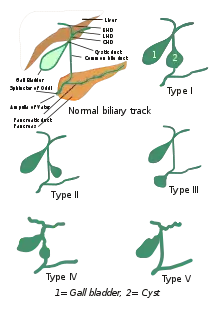 - Тип I — кистозное расширение общего желчного протока; сегментарное расширение общего желчного протока; цилиндрическое расширение общего желчного протока