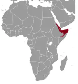 Ареал: Джибути, Эритрея, Эфиопия, Сомали, где распределён неравномерно. Есть сообщения о находке этого вида на высоте 1200 м над уровнем моря и сомнительное сообщение — на высоте 2200 м. Вид является жителем скалистых утесов (прячется в трещинах) в пустынных или полупустынных районах, иногда встречается вместе с даманами[2]. В Джибути живёт в местностях, покрытых песком и камнями с низким кустарником и травой. При размножении в неволе удалось получить 6 выводков, пять из них состояли из одного детёныша, один из двух.