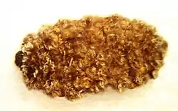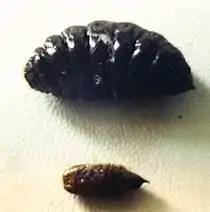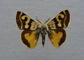 Выражен резкий половой диморфизм. Самки, в отличие от самцов, бескрылые, лишены усиков, глаз и ног[1][3]. Длина переднего крыла самцов 12—13 мм[3]. Размах крыльев самцов 17—25 мм[7][8]. Голова, грудь, брюшко покрыты длинными и густыми волосками. Ноги покрыты короткими волосками. Передние крылья округлой формы. Крылья желтоватого или желтовато-бежевого цвета с контрастными чёрными размытыми перевязями, поперечными полосами и пятнами. Задние крылья золотисто-оранжевые с широкой каймой чёрного цвета вдоль переднего и внешнего края[3]. Хоботок недоразвит. Самка практически состоит из одного толстого продолговато-округлого брюшка, полностью опушенного короткими волосками от серо-желтого до коричнево-жёлтого цвета[3]. Длина тела самок составляет от 13 до 18 мм, ширина от 8 до 10 мм.