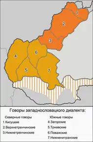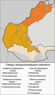 - Распространение среднесловацких форм числительных типа dvaja, traja или trja, štirja, pjaťi, pjaťich. В юго-западных говорах — pjaci, pjacich. В западных говорах — péci, pécich.