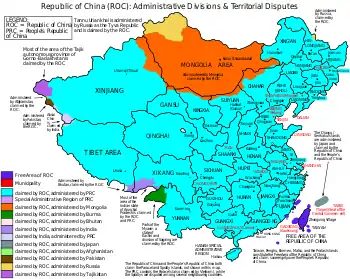 Китайская Республика была основана в 1912 году и управлялась партией Гоминьдан как однопартийное государство. Она контролировала значительную часть материкового Китая и Монголию (последнюю не ранее чем с 1917 и до 3 февраля 1921 года). После окончания Второй мировой войны под контроль Китайской Республики перешла принадлежавшая с 1895 года Японии группа островов Тайвань и Пэнху.