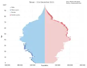 Население Тайваня на декабрь 2021 год оценивалось в 23 375 314 чел.[3] Так как площадь Китайской Республики составляет 36 197 км², то плотность населения равна 652,11 человека на квадратный км. Это 10-е место в мире по плотности населения и второе в Азии (после Бангладеш), если не учитывать микространы. Практически всё население Китайской Республики городское. Основное население Китайской Республики сосредоточено на равнинном западном побережье острова Тайвань и проживает в мегалополисе (перетекающих одна в другую городских агломерациях), от Синбэя на севере до Гаосюна на юге. По состоянию на 2019 год на севере острова Тайвань в столичной агломерации Большой Тайбэй проживала треть всего населения Китайской Республики. Убыль населения в 2021 году составила — 1,3 %.[3]