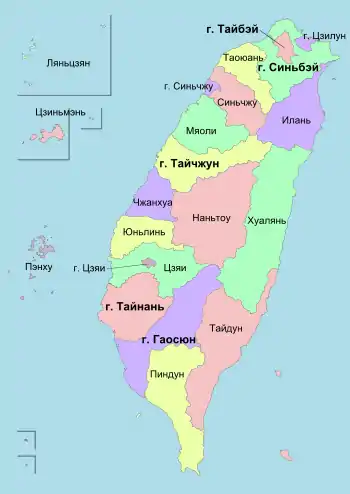 | Уезд Ляньцзян (острова Мацзу) | 連江縣 | Liánjiāng | Lienchiang County | Наньгань | 南竿 |