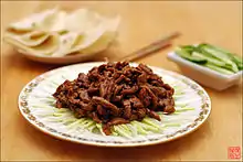 | Свинина, тушёная по-сычуаньски | 回鍋肉 | 回锅肉 | huíguōròu | Буквально — «мясо, вернувшееся в котёл»; известно так же как «дважды приготовленное мясо». Сначала стейки из свиной грудинки тушатся в воде со специями (имбирь, гвоздика, бадьян, мармелад или соль). После охлаждения для придания твердости мясу его нарезают тонкими ломтиками. Затем свинину возвращают в вок и обжаривают на масле, обычно вместе с некоторыми овощами. Чаще всего используются листья чеснока, пекинская капуста, сладкий перец и зелёный лук. |
