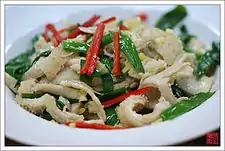 | Лацзыцзи | 辣子雞 | 辣子鸡 | làzǐjī | Блюдо, состоящее из маринованных, а затем обжаренных во фритюре кусочков курицы, сушеных сычуаньских перцев чили, острой фасолевой пасты, сычуаньских перцев, чеснока и имбиря. |
