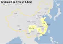 Понятие китайской кухни охватывает множество региональных кулинарий, однако наиболее известные и влиятельные среди них — кантонская, шаньдунская, цзянсуская (особенно хуайянская) и сычуаньская[10][11][12]. Они отличаются друг от друга из-за разных климатических условий, географии, истории и стиля жизни в соответствующих регионах. В кухне Цзянсу активно используются тушение и тушение после обжарки, а в Сычуани предпочитают запекание[10].