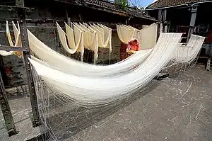 Рисовая лапша либо экструдируется из раствора муки, либо из него выпаривают лист теста, который режут на полосы. В тесто не добавляют соли.