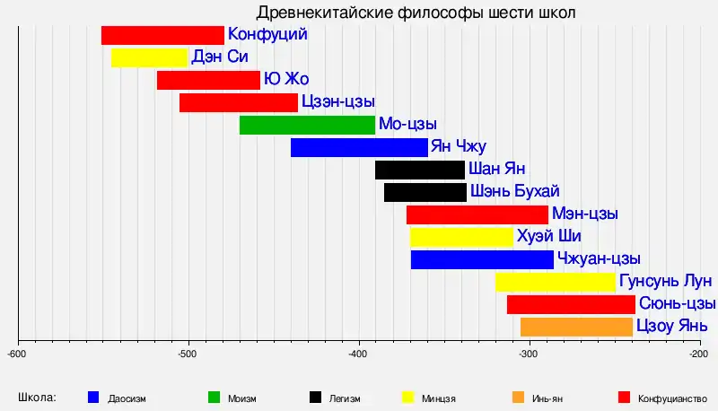 - школа имён (минцзя): несоответствие названий сущности вещей ведёт к хаосу. Представители: Дэн Си, Хуэй Ши, Гунсунь Лун; Мао-гун. Иногда относят Инь Вэня.