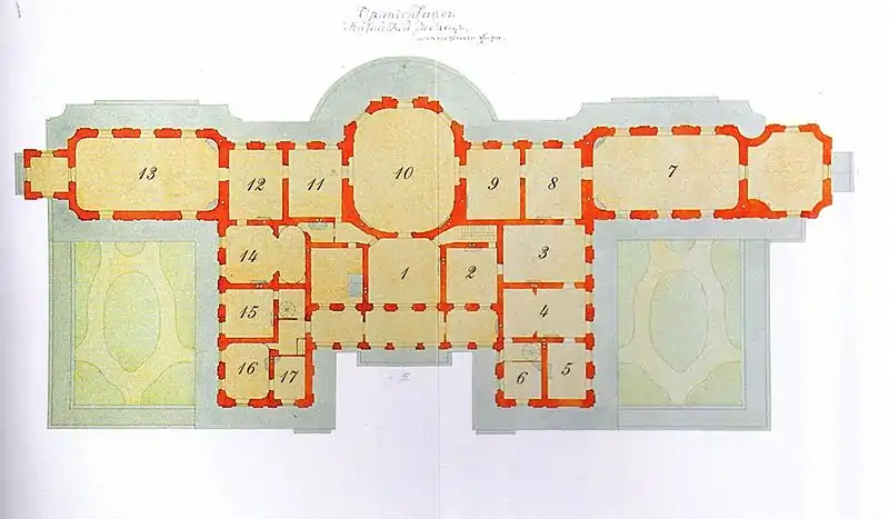 1 — Передняя 2 — Гардеробная Половина Павла: Парадная анфилада: Половина Екатерины II: |