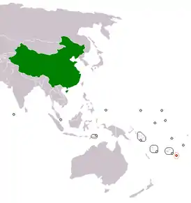 Океания, для Китайской Народной Республики и Китайской Республики (Тайвань), является этапом для непрерывного дипломатического соревнования. Восемь штатов Океании признают КНР, а шесть штатов признают КР. Эти цифры колеблются, поскольку островные государства Тихого океана переоценивают свою внешнюю политику и иногда смещают дипломатическое признание между Пекином и Тайбэем. В соответствии с политикой «единого Китая», ни одна страна не может поддерживать официальные дипломатические отношения с «обеими Китаями». Этот «или / или» фактор привел к тому, что КНР и КР активно прибегают к дипломатическим услугам от небольших тихоокеанских народы[1][2]. В 2003 году Китайская Народная Республика объявила о намерении укрепить свои дипломатические связи с форумом тихоокеанских островов и увеличить пакет экономической помощи, предоставляемой этой организацией. В то же время делегат КНР Чжоу Вэньчжун добавил: «ФТО должен воздерживаться от любых обменов официального характера или диалога какой-либо формы диалога с Тайванем»[3]. В 2006 году премьер-министр Китая Вэнь Цзябао объявил, что КНР расширит свое экономическое сотрудничество с островными государствами Тихого океана. КНР предоставил больше экономической помощи, отменил тарифы на экспорт из наименее развитых стран Тихого океана, аннулировал задолженность этих стран, распространил бесплатные лекарства против малярии и обеспечил обучение для двух тысяч правительственных чиновников и технического персонала островов Тихого океана[4]. Также в 2006 году Вэнь стал первым китайским премьер-министром, посетившим острова Тихого океана, которые «Тайбэй Таймс» назвал «давним дипломатическим полем битвы за Китай и Тайвань». Точно так же, по словам Рона Крокомба, профессора тихоокеанских исследований в Южнотихоокеанском университете, «Министров тихоокеанских островов было больше, чем в любую другую страну»[5].