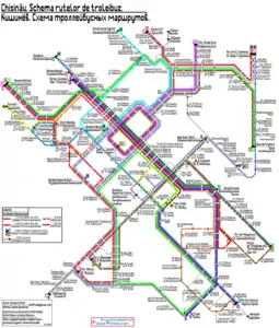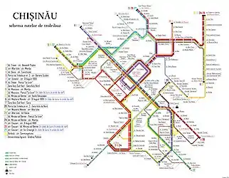 В Кишинёве действуют 32 троллейбусных маршрутов. Время работы кишинёвского троллейбуса[35] с 5 до 22 часов, маршруты 8, 12, 22 и 24 — до 01:21 часов. В настоящее время[36] троллейбусная сеть города охватывает все сектора Кишинёва — от Южного автовокзала (южная окраина Кишинёва) до улицы Ион Думенюк в секторе Чеканы (северная окраина города), троллейбусное сообщение налажено между центром города и его спальными районами (Буюканы, Ботаника, Чеканы). С появлением автономных троллейбусов в 2017 году были открыты 9 новых маршрутов, позволяющих добраться до кишиневского аэропорта, а также до пригородов: Сынджера, Ставчены, Трушены, Бубуечь. В начале февраля 2019 впервые за всю историю кишиневского троллейбуса было налажено непрерывное сообщение между Кишиневом и городом Яловены, не входящим в состав муниципия.