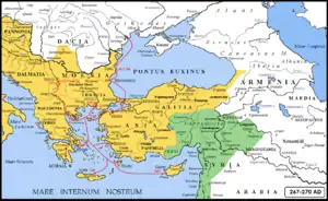 В 268 году ситуация в Римской империи ухудшилась[24]. Готы вторглись в Мезию и Фракию, были осаждены Фессалоники. Ещё в 267 году герулы начали морское вторжение в причерноморские поселения, захватив Византий, но потерпели неудачу при набеге на вифинское побережье. Это заставило их отправиться на запад и пересечь Эгейское море, чтобы напасть на богатые, но плохо защищённые земли Греции. По дороге они разграбили острова Лемнос и Скирос, высадились в Аттике, где разорили Афины. Затем герулы прошли через Истмийский перешеек, недостроенные укрепления которого не смогли их остановить. Коринф, Спарта и Аргос были полностью разграблены. Затем захватчики направились в Беотию. Здесь они столкнулись с крупной римской армией под командованием Марциана. Однако его сил было недостаточно, чтобы полностью остановить противника, но зимой ему удалось отогнать герулов на север в Эпир и Македонию к Галлиену, который выступил из северной Италии. Наконец, весной 268 года в долине Нессоса (или Неста) на границе между Македонией и Фракией Галлиен одержал победу над варварами. С вождём герулов Навлобатом император пришёл к соглашению, предоставив ему право отступить за пределы империи. В этот момент Галлиену пришла весть, что его военачальник Авреол поднял мятеж в северной Италии. Галлиен сразу оценил серьёзность ситуации: если он потеряет контроль над этим регионом, то его положение станет безнадёжным. Оставив Марциана оборонять дунайскую границу, цезарь собрал большую армию и отправился в Италию для борьбы с новой угрозой[25][26].