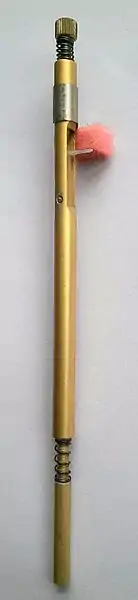 ![]() Современный металлический толкачик, сверху и снизу винты для регулировки механики |