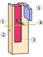 На рисунке 2 изображено устройство верхней части толкачика: 1 — струна, 2 — ось лангетты, 3 — лангетта (от фр. languette), 4 — плектр, 5 — демпфер.