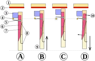 - D — клавиша отпущена, толкачик опускается, при этом лангетта отклоняется в сторону (10), позволяя плектру почти беззвучно соскользнуть со струны, затем демпфер заглушает вибрацию струны, а лангетта с помощью пружины возвращается в исходное состояние.
