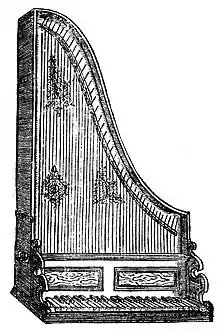 - мюзелар — прямоугольной формы, с мануалом справа от центра и струнами, расположенными перпендикулярно клавишам;