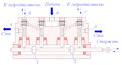 При необходимости перенаправить потоки жидкости оператор перемещает ручку управления, которая связана кинематической связью с кольцом стержня (см. рисунок). При перемещении стержня выступы 1 и 2 открывают ту или иную пару клапанов, благодаря чему осуществляется перенаправление потоков жидкости. Подача жидкости от насоса осуществляется через канал в, а слив жидкости в гидробак осуществляется по каналам либо а, либо д. Жидкость поступает к гидродвигателям или сливается от них (в зависимости от положения стержня) по каналу либо б, либо г.