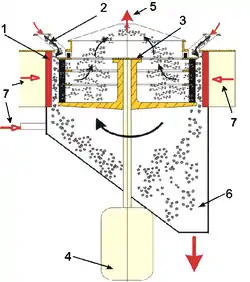 Материал в классификатор подается в виде пылевоздушной смеси через воздуховоды 7 или сыпется в воздушный поток через патрубки 2. Через рабочее колесо 3, представляющее собой решетчатое колесо по типу «беличьего», приводимое во вращение приводом 4 просасывается пылевоздушная смесь, которая затягивает с собой и частицы материала, но центробежное воздействие колеса отбрасывает тяжелые и крупные частицы на периферию к стенкам, где частицы оседают по конусу и выгружаются 6, а частицы меньшего размера проникают с воздухом внутрь колеса и выдуваются в систему циклонов 5.