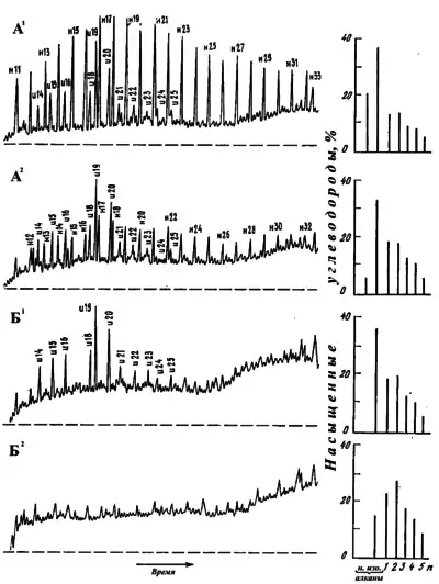 Первый класс нефтей характеризуется тем, что бензиновые фракции содержат >50 % парафиновых углеводородов, а масляные фракции — < 20 % твёрдых парафинов, а количество смолисто-асфальтеновых соединений этих нефтей крайне мало. В состав парафино-нафтеновых нефтей входит большое количество нафтеновых углеводородов и небольшое количество парафиновых; по составу твёрдых парафинов и смолисто-асфальтеновых соединений они схожи с парафиновыми нефтями. Нафтеновые нефти характеризуются большим содержанием (≈ 60 %) нафтеновых углеводородов, содержание твёрдых парафинов, смол и асфальтенов очень низко. Четвёртый класс нефтей отличается приблизительно одинаковым содержанием парафиновых, нафтеновых и ароматических углеводородов, в то время, как твёрдый парафин не достигает 1—1,5 % по составу; количество смолисто-асфальтеновых веществ в составе достигает 10 %. В составе нафтено-ароматических нефтей преобладают углеводороды этих классов, причем их процентное содержание увеличивается по мере утяжеления нефти, а в лёгких фракциях нефтей данного класса содержатся и парафиновые углеводорода, а количество твёрдых парафинов не превышает 0,3 %;при этом количество смол и асфальтенов в составе нафтено-ароматические нефтей достигает 15—20 %. Ароматические нефти отличаются высокой плотностью и большим преобладанием в них аренов[9].