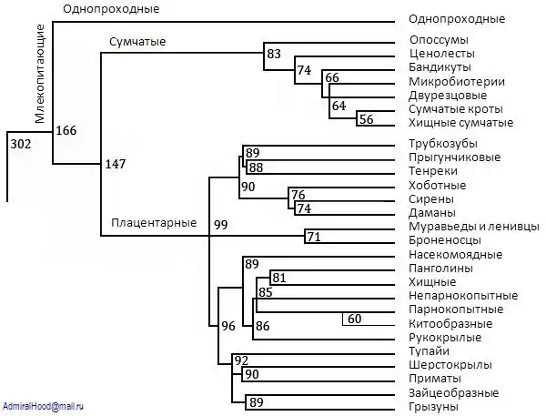На представленном ниже филогенетическом дереве (хронограмме) современных отрядов млекопитающих видны ветви, отвечающие прототериям (представлены отрядом однопроходных), метатериям (представлены сумчатыми) и эутериям (представлены плацентарными). Дерево построено по данным сайта OneZoom Tree of Life[51] (интерактивного ресурса, отображающего филогенетические связи между различными группами живых существ), которые в основном отражают результаты статьи «The delayed rise of present-day mammals» (О. Бининда-Эмондс и др., 2007)[52]. Цифры при узлах указывают ориентировочное время расхождения сестринских групп (млн лет назад). В ряде более поздних работ, впрочем, приведённые здесь оценки были пересмотрены (иногда значительно)[53][54].