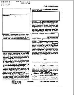 Подавляющее большинство секретных документов правительства создаются как «производные засекреченные». Например, если одна страница информации, взятой из секретного документа, помещается в документ вместе с 100 страницами несекретной информации, такой документ в целом будет секретным. Правила засекречивания (часто игнорируемые) предусматривают, что каждый параграф документа должен иметь маркировку: U (Unclassified) — открытая информация, C (Confidential) — «секретно», S (Secret) — «совершенно секретно», и TS (Top Secret) — «совершенно секретно, особой важности». Таким образом, в приведённом примере, только один параграф должен иметь маркировку S. Если этот параграф находится с двух сторон листа, то страница должна быть отмечена SECRET сверху и снизу[19].