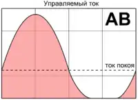 Чтобы воспроизвести одну полуволну входного сигнала без искажений в области перехода через ноль, усилитель должен оставаться линейным при нулевом напряжении на входе — поэтому в усилительных элементах в режиме B всегда устанавливается небольшой, но не нулевой, ток покоя. В ламповых усилителях мощности в режиме B ток покоя составляет 5…15 % от максимального выходного тока, в транзисторных усилителях — 10…100 мА на каждый транзистор[17][18]. Все эти усилители двухтактные: одно плечо усилителя воспроизводит положительную полуволну, другое — отрицательную. На выходе обе полуволны складываются, формируя минимально искажённую усиленную копию входного сигнала. При малых мгновенных значениях выходного напряжения (в транзисторных усилителях — несколько сотен мВ) такой каскад работает в режиме A, при бо́льших напряжениях одно из плеч закрывается и каскад переключается в режим B.
