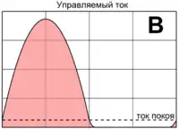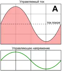 Режим А — такой режим работы усилительного элемента (транзистора или лампы), в котором при любых допустимых мгновенных значениях входного сигнала (напряжения или тока) ток, протекающий через усилительный элемент, не прерывается. Усилительный элемент не входит в режим отсечки, не отключается от нагрузки, поэтому форма тока через нагрузку более или менее точно повторяет входной сигнал. В частном случае усилителя гармонических колебаний режим А — такой режим, в котором ток через усилительный элемент протекает в течение всего периода, то есть угол проводимости 2Θc равен 360°[8][9].