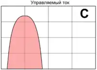 В режиме C, также как и в режиме B, усилительный элемент воспроизводит только положительные, либо только отрицательные входные сигналы. Однако рабочая точка усилительного элемента выбрана так, что при нулевом напряжении на входе (или при нулевом управляющем токе) усилительный элемент заперт. Ток через усилительный элемент возникает только после перехода управляющего сигнала через ноль; если этот сигнал гармонический, то усилитель воспроизводит одну искажённую полуволну (угол проводимости меньше 180°)[24]. В недонапряжённом режиме C амплитуда входного сигнала невелика, поэтому усилитель способен воспроизвести вершину этой полуволны. В перенапряжённом режиме C амплитуда входного сигнала столь велика, что усилитель искажает (срезает) и вершину полуволны: такой каскад преобразует синусоидальный входной сигнал в импульсы тока трапециевидной формы. Предельный теоретический КПД недонапряжённого усилителя в режиме C, так же как и в режиме B, равен 78,5 %, перенапряжённого — 100 %[15]. Из-за высоких нелинейных искажений усилители в режиме С, даже двухтактные, непригодны для воспроизведения широкополосных сигналов (звука, видеосигналов, постоянного тока). В резонансных усилителях радиопередатчиков они, напротив, широко применяются благодаря их высокому КПД.[24].