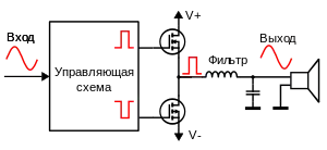 Несмотря на созвучие с английским digital («цифровой»), усилители класса D не являются, в общем случае, цифровыми устройствами. Простейшая и наиболее распространённая схема усилителя класса D с синхронной широтно-импульсной модуляцией (ШИМ) — это полностью аналоговая схема. В её основе — задающий генератор сигнала треугольной формы, частота которого обычно равна 500 кГц, быстродействующий компаратор, и формирователь импульсов, открывающих выходные транзисторы. Если мгновенное значение входного напряжения превышает напряжение на выходе генератора, компаратор подаёт сигнал на открытие транзисторов верхнего плеча, если нет — то на открытие транзисторов нижнего плеча. Формирователь импульсов усиливает эти сигналы, попеременно открывая транзисторы верхнего и нижнего плеча, а включенный между ними и нагрузкой LC-фильтр сглаживает отдаваемый в нагрузку ток. На выходе усилителя — усиленная и демодулированная, очищенная от высокочастотных помех копия входного напряжения[32][33].