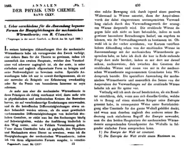 В 1865 г. появилась работа «О различных удобных для применения формах второго начала математической теории теплоты», в которой Клаузиус ввёл важнейшее для термодинамики понятие энтропии[5].