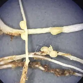 Корни клевера несут на своих ветвях особого рода вздутия — клубеньки, встречающиеся и у многих других бобовых[13]. Внутри клубеньков поселяются особые клубеньковые бактерии (обычно Rhizobium trifolii), способные фиксировать азот из воздуха, содержащегося в почве, и передавать его растению в удобной для ассимиляции форме[14]. Это объясняет накопление азота в почве, где рос клевер или другие бобовые, и делает целесообразным удобрение почвы путём запахивания бобовых (так называемые «зелёные удобрения», или сидерация)[15][12].