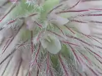 Соцветия — головки, округлые в начале цветения, позднее — цилиндрические. Цветки с мелким бледно-розовым венчиком. Венчик в длину равен чашечке или короче её. Чашечка — с мохнатоволосистыми зубцами.