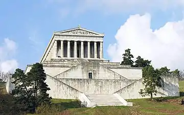 В 1813 году был открыт конкурс на создание Вальхаллы — «Зала славы Германской нации». В скандинавской мифологии Вальхалла — небесный рай, место успокоения павших героев (замысел кронпринца Людвига относится к 1807 году). В конкурсе приняли участие многие немецкие архитекторы. К. Ф. Шинкель прислал на конкурс проект в готическом стиле, породивший долгие дебаты о стиле, в наибольшей степени выражающем «национальный дух» в архитектуре и величие германской нации. Вариант Шинкеля был отвернут в пользу «греческого» проекта, созданного Лео фон Кленце. В 10 км к востоку от Регенсбурга на левом высоком берегу Дуная по проекту Кленце в 1830—1842 годах возвели здание, повторяющее в общих чертах архитектуру Парфенона афинского Акрополя (1830—1842). Размеры Вальхаллы почти в точности совпадают с размерами Парфенона. Его длина составляет 48,5 м, ширина — 14 м и высота — 15,5 м. Как и Парфенон, германский монумент имеет 8 х 17 колонн дорического ордера по главному и боковым фасадам[16].