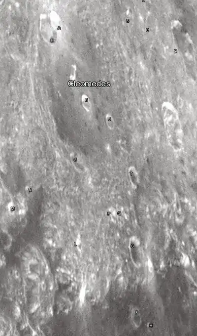 - Сателлитный кратер Клеомед E имеет борозды на дне чаши.