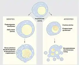 Физическое или химическое повреждение клеток, а также недостаток источников энергии и кислорода, может привести к другой смерти — некротической. Некроз, в отличие от апоптоза, — пассивный процесс, он часто сопровождается разрывом плазмалеммы и утечкой цитоплазмы. Некроз почти всегда вызывает воспаление окружающих тканей. В последнее время исследуется механизм запрограммированного некроза как возможной противовирусной и противоопухолевой защиты[19].