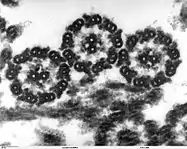 Поперечное сечение жгутиков хламидомонады (ПЭМ) |